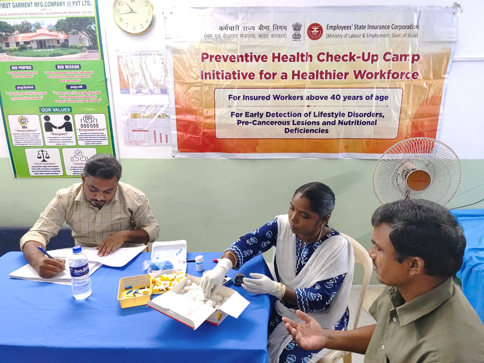 Photo Gallery - Preventive health check-up camp at First Garments Pvt Ltd, Madurai, on 24.08.2024.
