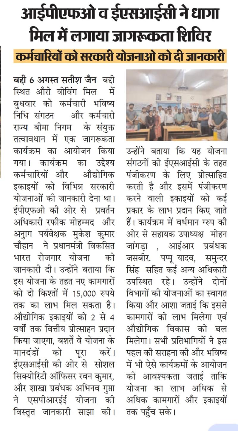 Photo Gallery - शाखा कार्यालय, बद्दी द्वारा दिनांक 06.08.2025 को बद्दी स्थित M/s औरो वीविंग में SPREE य़ोजना(Scheme to Promote Registration of Employers/Employees) के संबंध में जागरुकता शिविर का आयोजन किया गया।