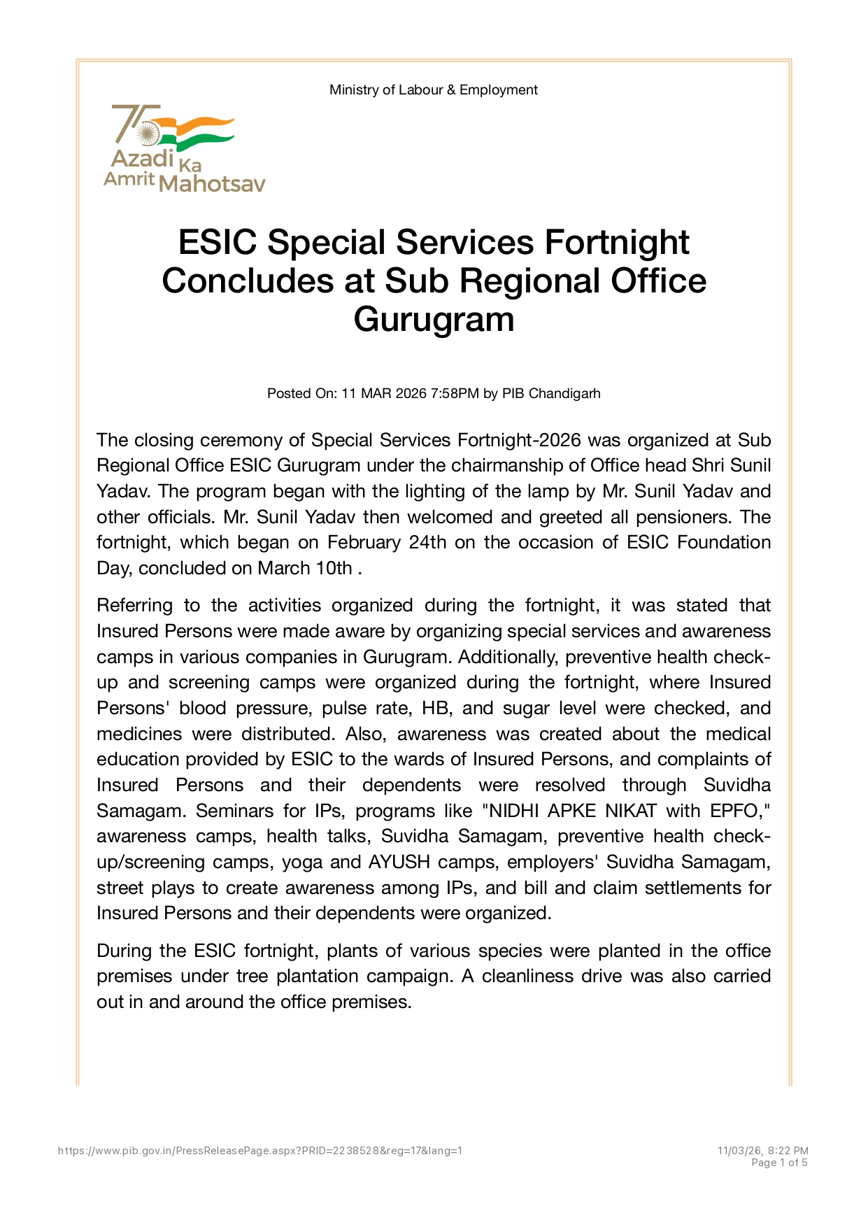 ESIC Special Services Fortnight concludes at SRO Gurugram size:(7.92 MB)