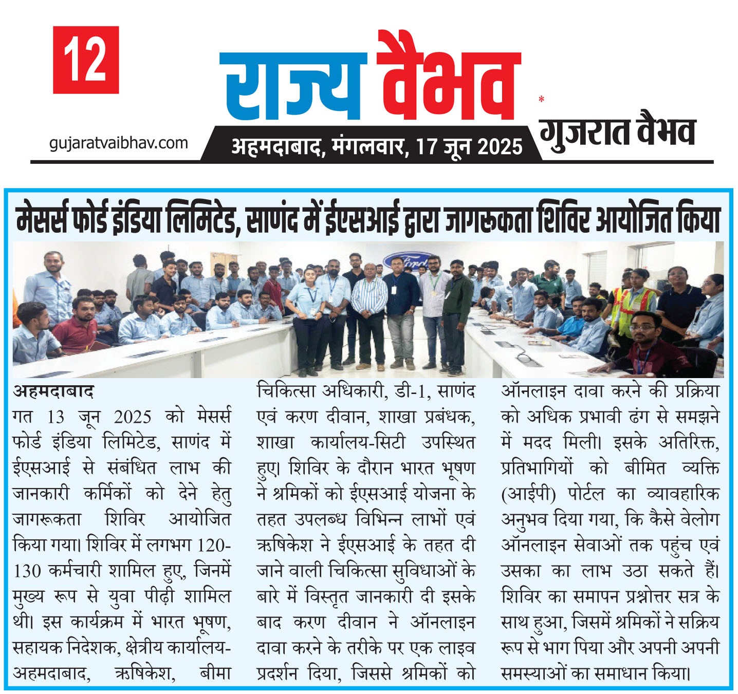 मेसर्स फोर्ड इंडिया लिमिटेड, साणंद में ईएसआई द्वारा जागरूकता शिविर आयोजित किया size:()