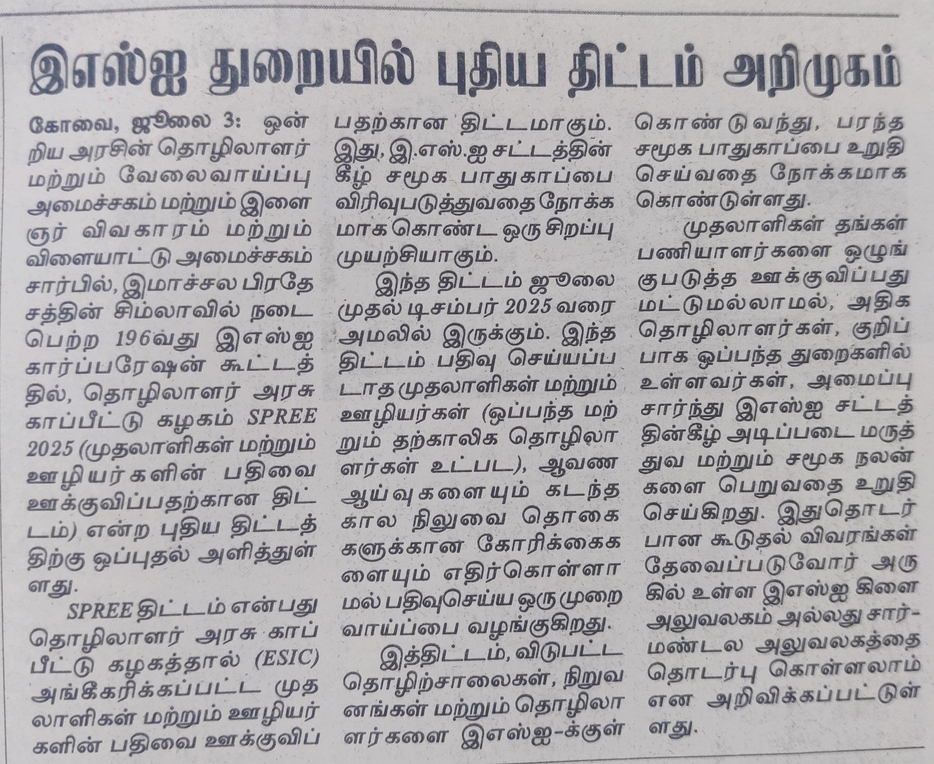 Scheme to Promote Registration of Employers/ Employees (SPREE) - News published in Dinakaran & Dailythanthi dt 03.05.2025 size:(310.89 KB)