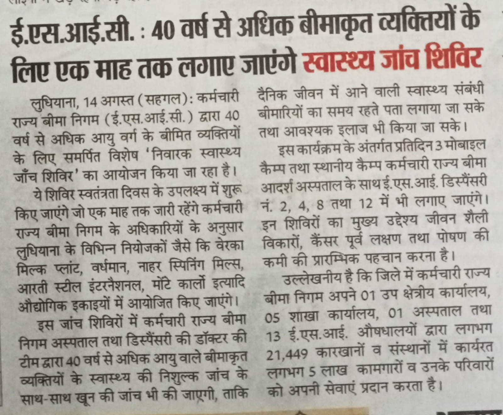 78वी वर्षगांठ के उपलक्ष में कर्मचारी राज्य बीमा निगम द्वारा 40 वर्ष से अधिक बीमाकृत व्यक्तियों के लिए लगाया जा रहा है “स्वास्थ्य जाँच शिविर” size:(97.59 KB)