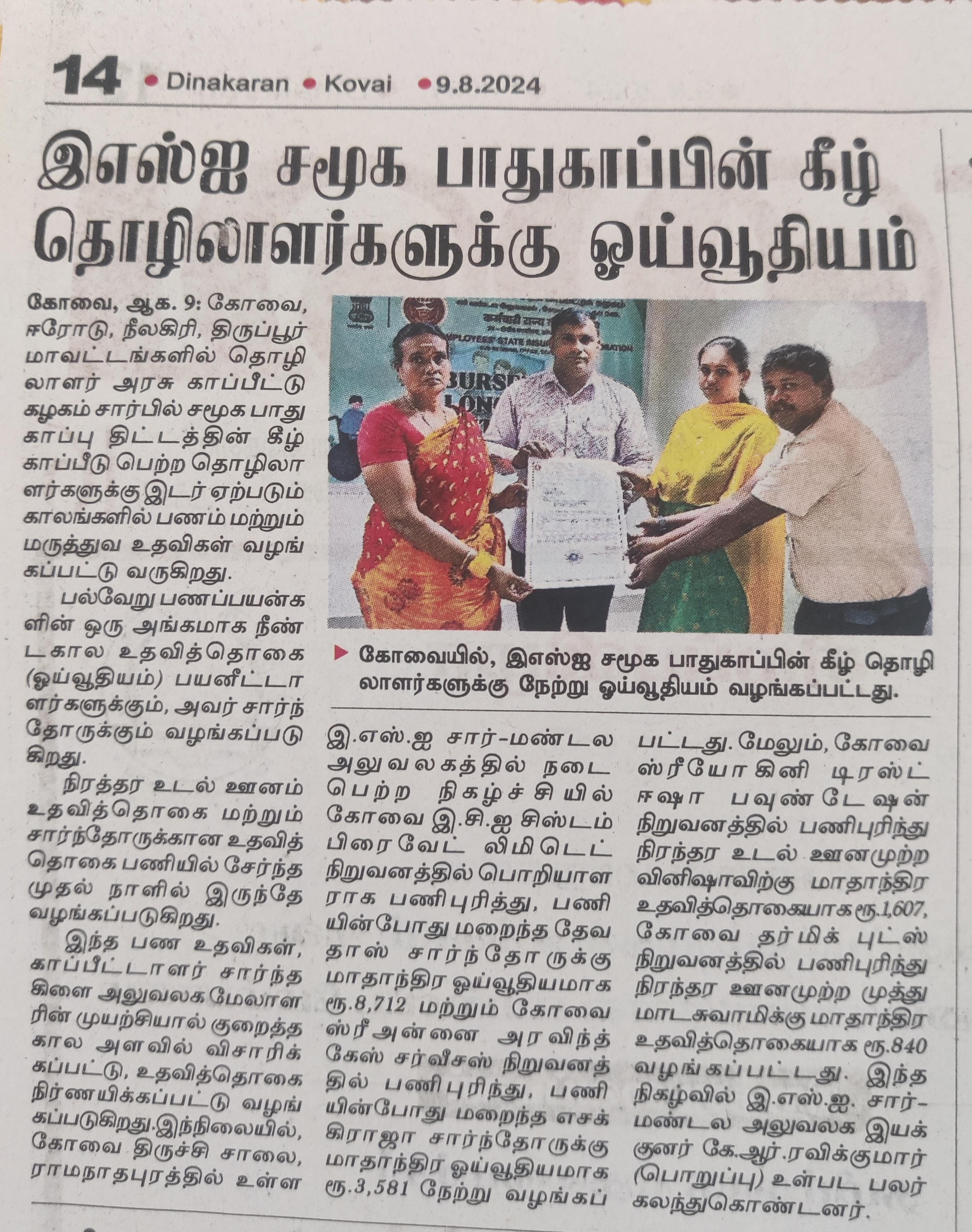Disbursement of Two Permanent Disability Benefits and Two Dependents Benefits connected with Kattoor and Ondiputhur Branch Offices to the Beneficiaries and to their Dependents by Shri K.R Ravi Kumar, Dy Director In-charge and other officers of SRO Coimbatore . News published in Dinakaran and Daily Thanthi dt 09th Aug 2024. size:(980.57 KB)