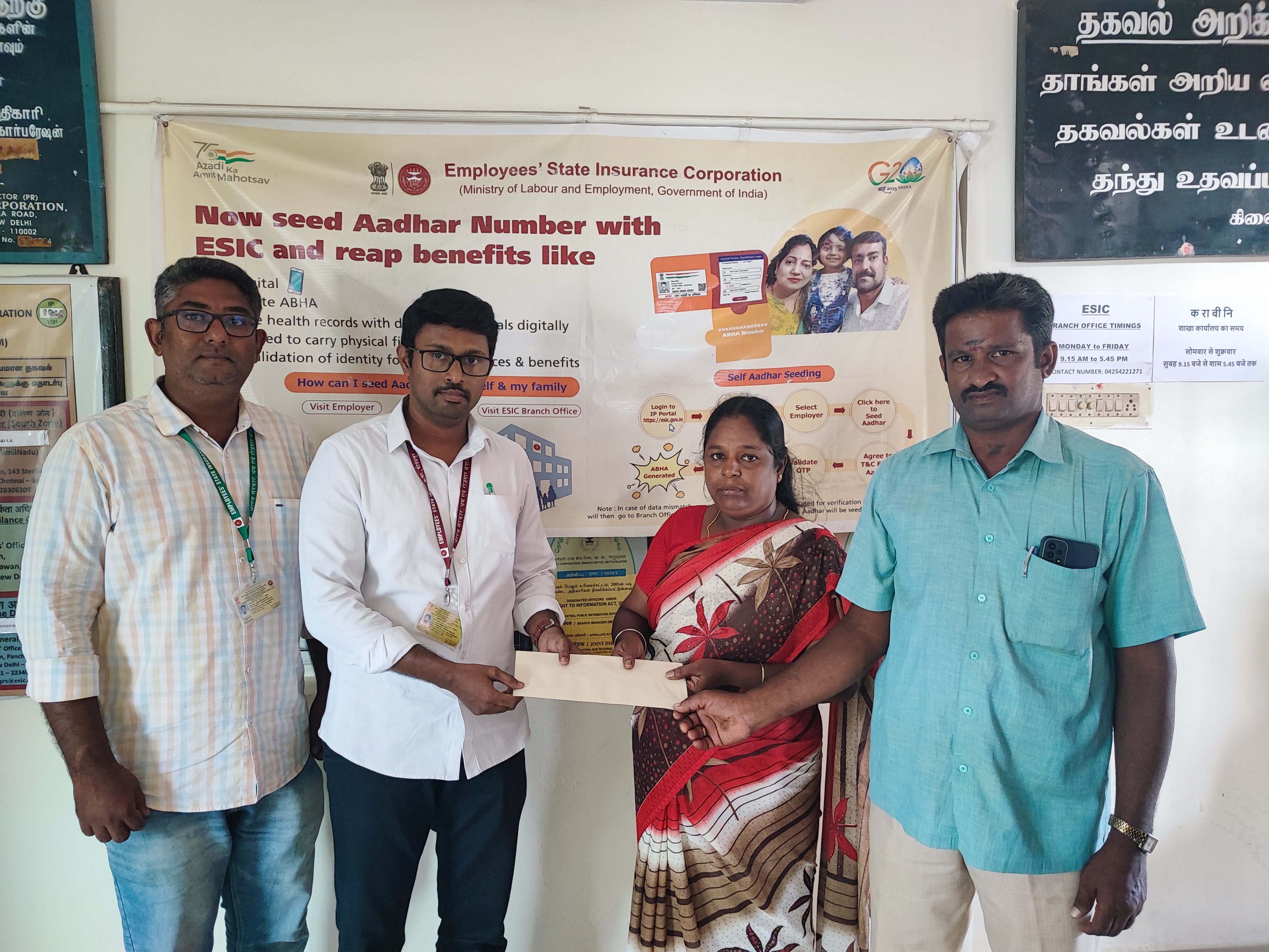 Disbursement of DB to the dependents of Deceased IP Selvaraj by Shri. E. Esakki Siva, Deputy Director of ESI Corporation, Sub Regional Office, Coimbatore and Shri. V. Srirajsivashankar, Branch Manager, Branch Office Mettupalayam - English version size:(230.11 KB)