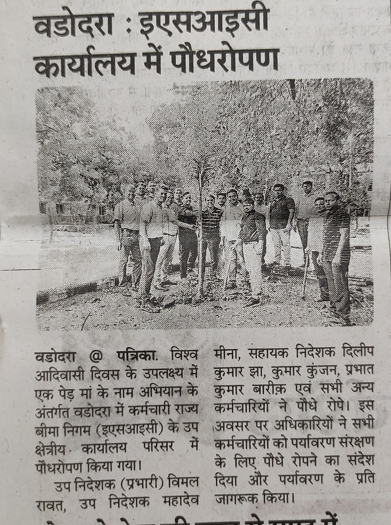 आज दिनांक 09.08.2024 को विश्व आदिवासी दिवस के उपलक्ष्य में ‘’एक वृक्ष माँ के नाम अभियान’’ के अंतगर्त कर्मचारी राज्य बीमा निगम,उप क्षेत्रीय कार्यालय, वड़ोदरा परिसर में वृक्षारोपण किया गया. size:(372.11 KB)