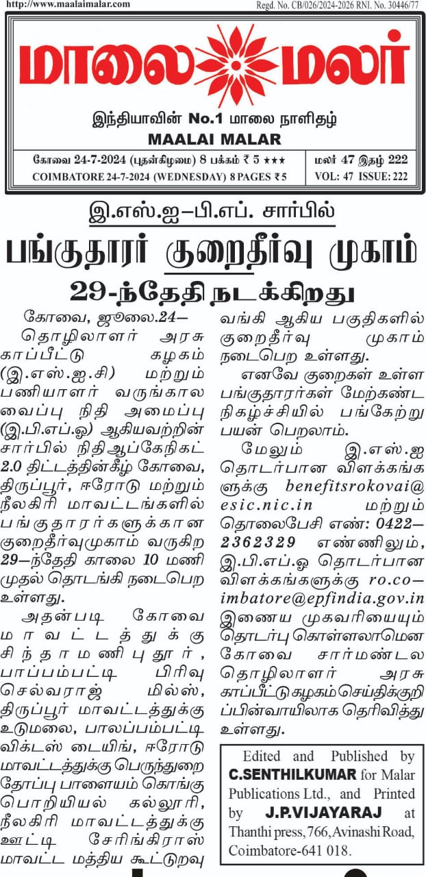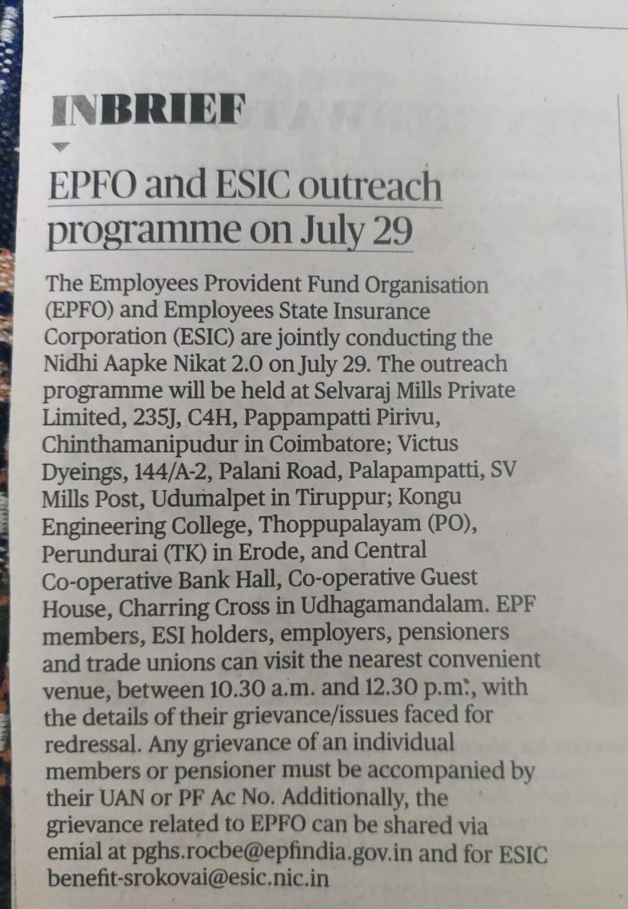 The Employees’ State Insurance Corporation ESIC and the Employees’ Provident Fund Organisation EPFO jointly organising the Suvidha Samagam and Nidhi Aapke Nikat 2.0 district outreach programme at four places in Coimbatore, Tiruppur, Erode and Udhagamandalam districts on 29th July 2024. size:(200.35 KB)