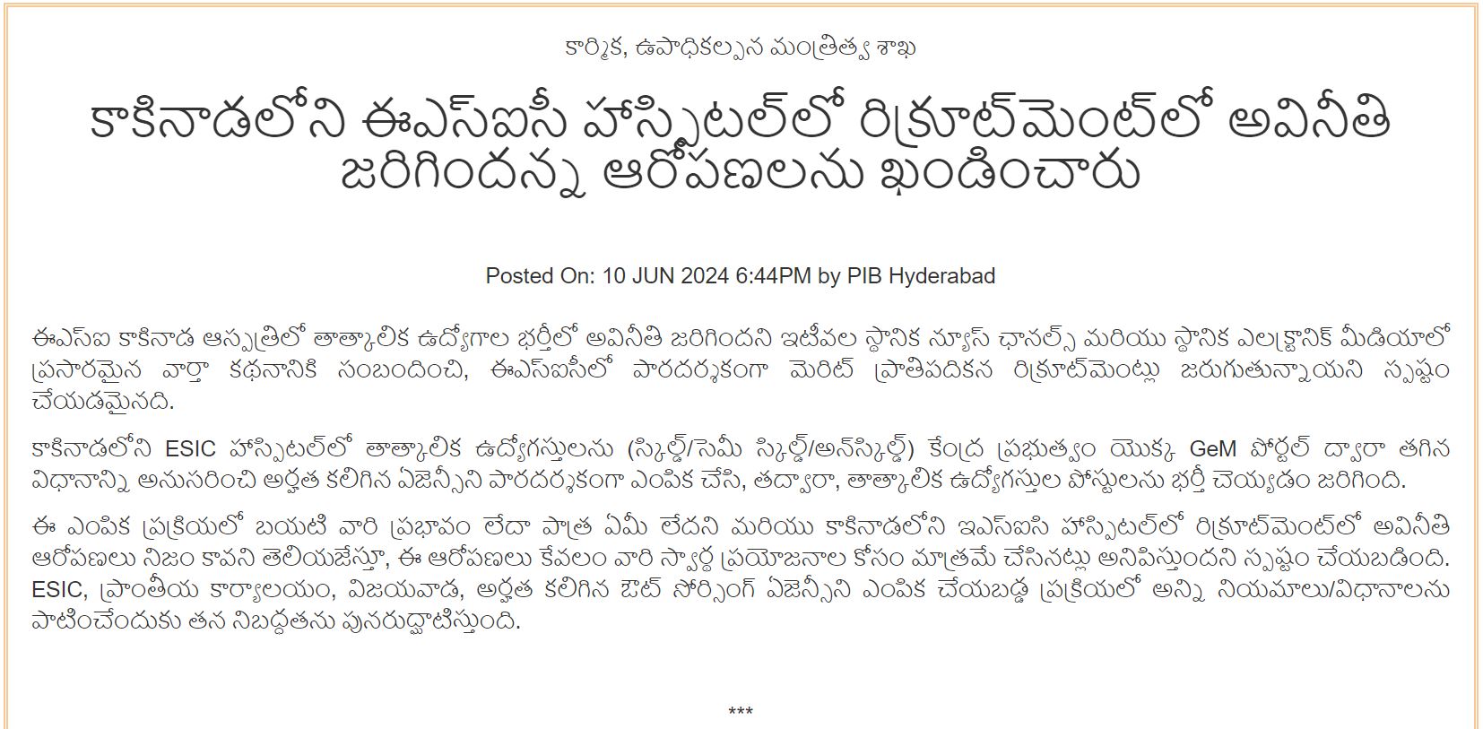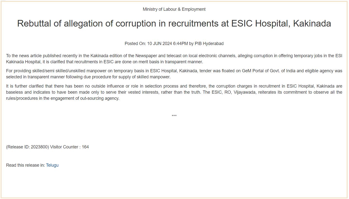 Rebuttal of allegation of corruption in recruitments at ESIC Hospital, Kakinada - English Version size:(38.47 KB)