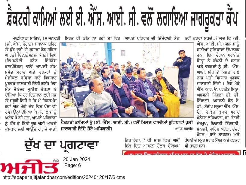 उप क्षेत्रीय कार्यालय, लुधियाना और ईएसआई आदर्श अस्पताल, लुधियाना द्वारा मिलकर मै. आरती इंटरनेशनल लिमिटेड, लुधियाना में एक जागरूकता एवं स्वास्थ्य जाँच शिविर का आयोजन किया गया। size:()