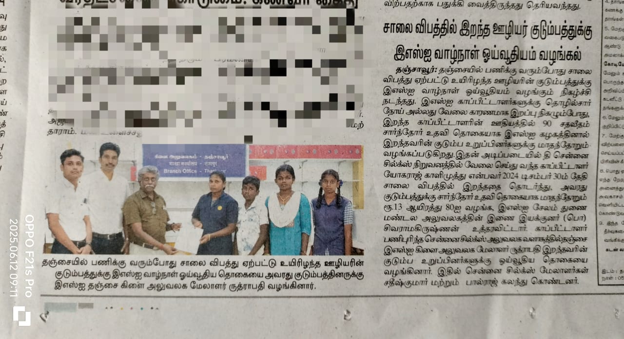 DISBURSEMENT OF DEPENDENT BENEFIT TO THE FAMILY OF DECESSED IP SHRI. YOGARAJ KALIMUTHU BY BO THANJAVUR – PUBLISHED ON 10/05/2025 IN DINAMANI, 11/06/2025 IN DINAKARAN, 10/05/2025 IN DINAMALAR, 10/05/2025 IN THE HINDU, THANJAVUR size:()