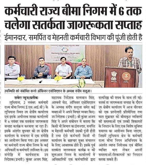 कर्मचारी राज्य बीमा निगम द्वारा दिनांक 31.10.2022 से 06.11.2022 तक चलेगा सतर्कता जागरूकता सप्ताह। size:()