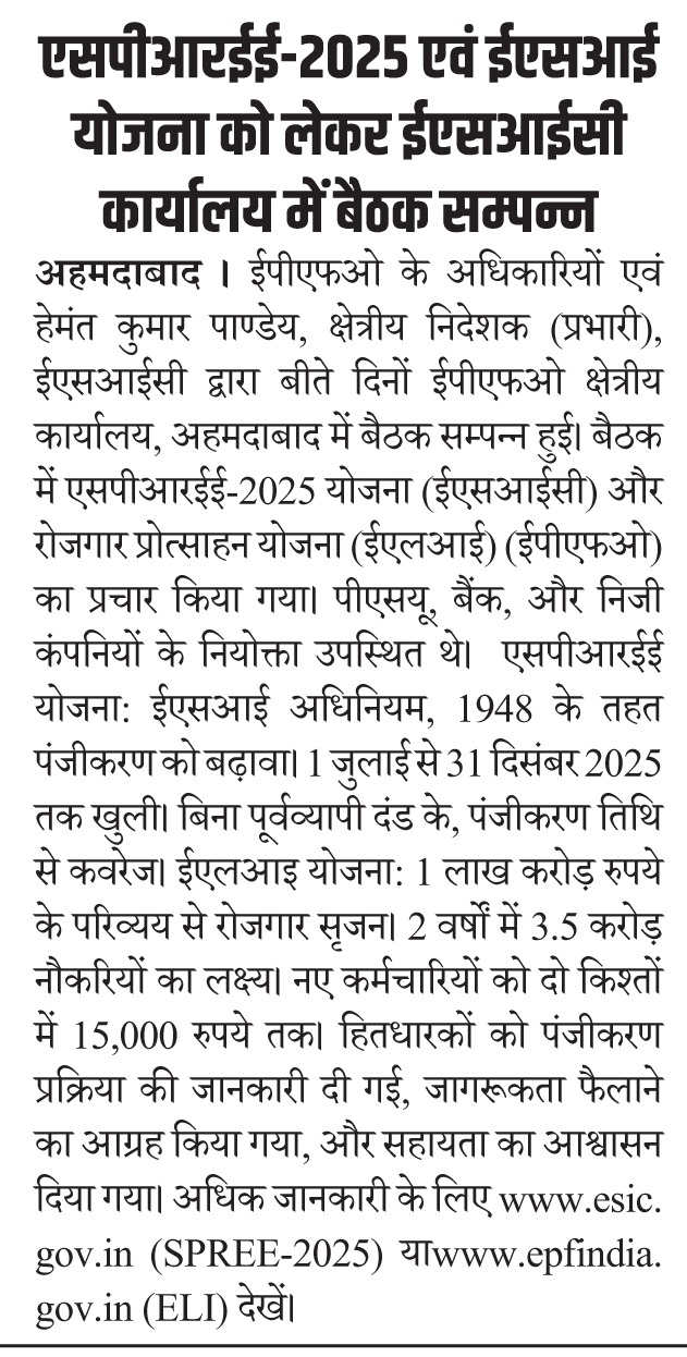 ईएसआईसी स्प्री 2025 योजना के विषय में श्रम अधीक्षकों एवं श्रम प्रवर्तन पदाधिकारियों के साथ बैठक का आयोजन(Language- Hindi) size:(370.87 KB)