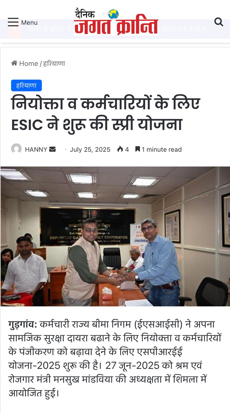 पंजाब केसरी-दिनांक 07.08.2025- ईएसआईसी ने सामाजिक सुरक्षा कवरेज विस्तार करने को नियोक्ताओ व कर्मचारियों के पंजीकरण को बढ़ावा देने की योजना SPREE 2025 शुरू की। size:(98.63 KB)